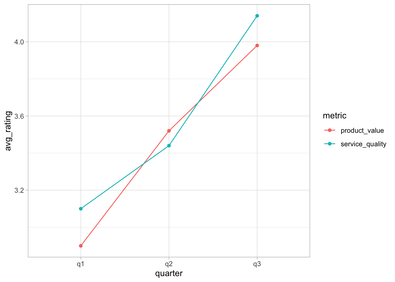ggplot(data = satisfaction_summary, mapping =aes(x = quarter, y = avg_rating, colour = metric, group = metric) ) +geom_point() +geom_line() +theme_light()