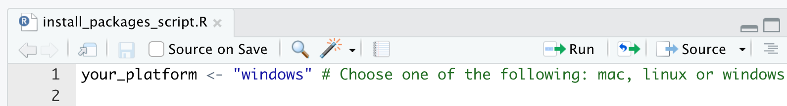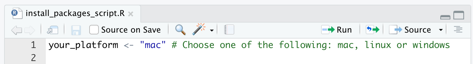 install_packages_script.Rin R-Studio. To this end, right-click on the file and selectOpen with, and then choose R-Studio. - Adjust the first line of the script to the OS you are using. For instance, when you are using a Mac the file should look like this: