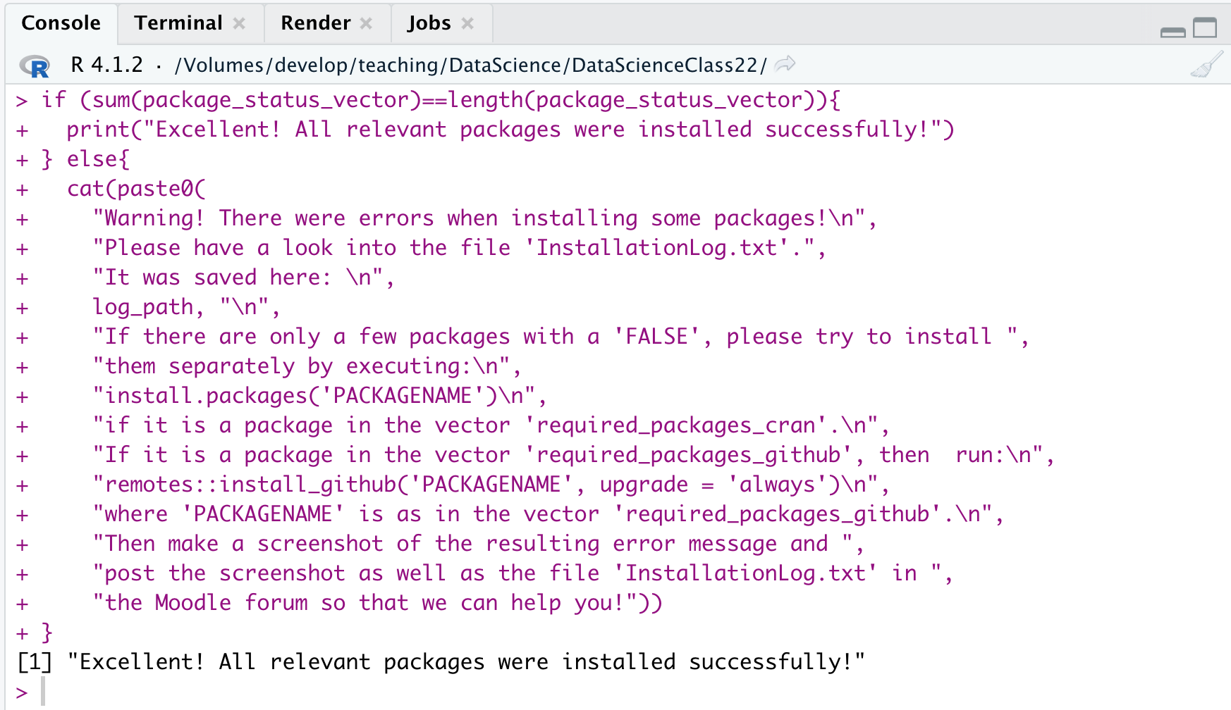 - Select the rest of the scrip and run it as you did with the first lines. If you get the following message everything worked well and all packages were installed successfully: