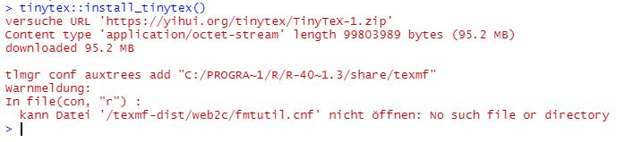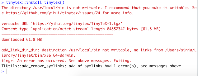 The following hints should be helpful if after the attempted installation of tinytex you see either one of these error messages: