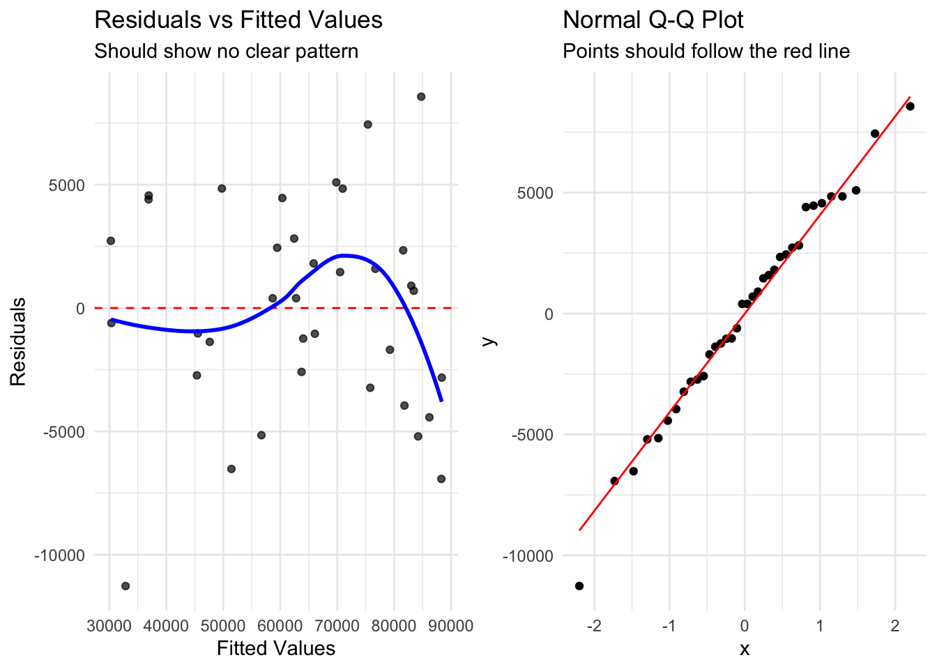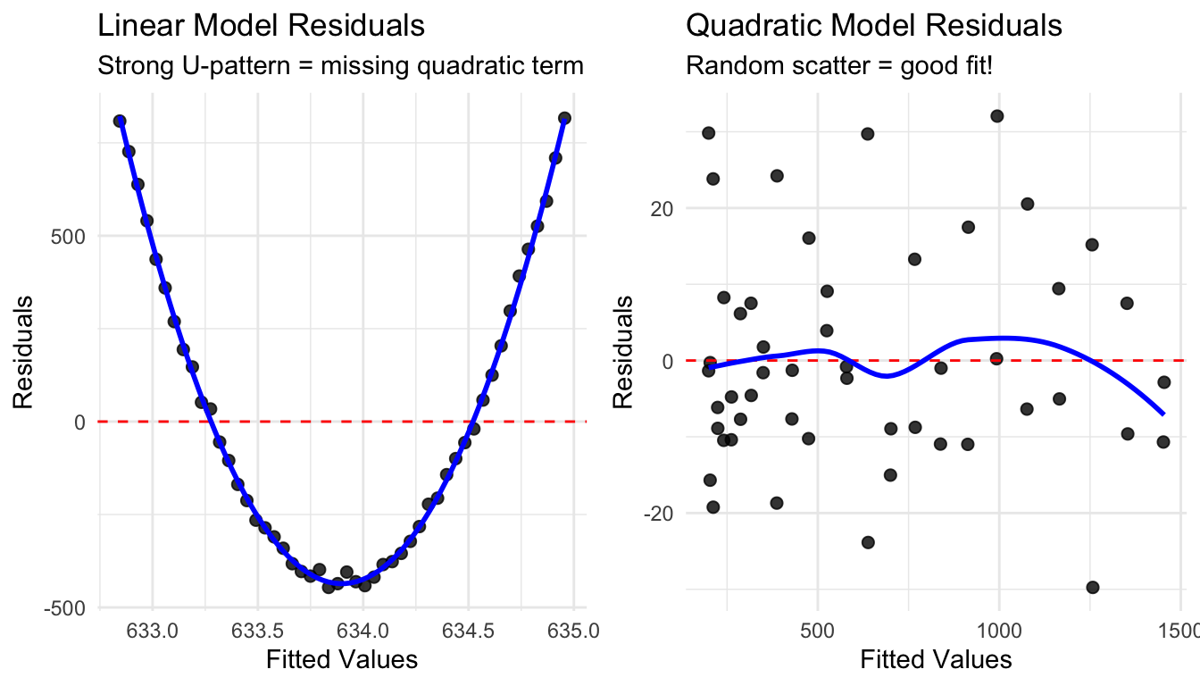# Compare residual patternslibrary(gridExtra)# Linear model residuals - should show clear patternp1 <- marketing_efficiency_data %>%mutate(fitted =fitted(marketing_linear), residuals =residuals(marketing_linear)) %>%ggplot(aes(x = fitted, y = residuals)) +geom_point(size =2, alpha =0.8) +geom_hline(yintercept =0, color ="red", linetype ="dashed") +geom_smooth(se =FALSE, color ="blue") +labs(title ="Linear Model Residuals", subtitle ="Strong U-pattern = missing quadratic term",x ="Fitted Values", y ="Residuals") +theme_minimal()# Quadratic model residuals - should be randomp2 <- marketing_efficiency_data %>%mutate(fitted =fitted(marketing_quadratic), residuals =residuals(marketing_quadratic)) %>%ggplot(aes(x = fitted, y = residuals)) +geom_point(size =2, alpha =0.8) +geom_hline(yintercept =0, color ="red", linetype ="dashed") +geom_smooth(se =FALSE, color ="blue") +labs(title ="Quadratic Model Residuals", subtitle ="Random scatter = good fit!",x ="Fitted Values", y ="Residuals") +theme_minimal()gridExtra::grid.arrange(p1, p2, ncol =2)