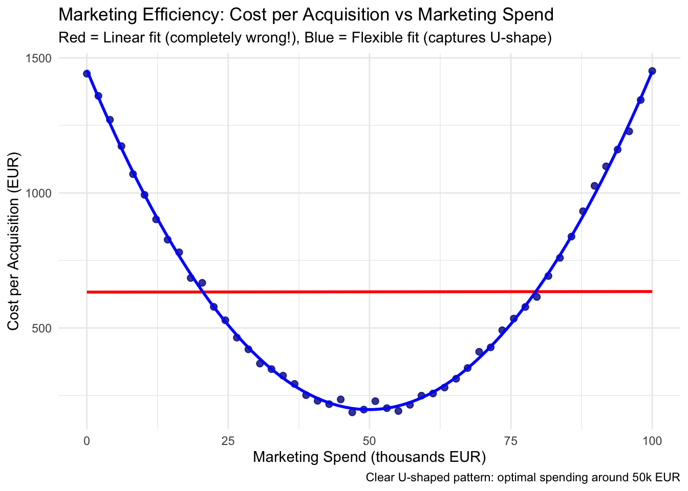 # First, visualize the clear U-shaped relationshipggplot(marketing_efficiency_data, aes(x = marketing_spend, y = cost_per_acquisition)) +geom_point(size =2, alpha =0.8, color ="darkblue") +geom_smooth(method ="lm", se =FALSE, color ="red", linewidth =1) +geom_smooth(method ="loess", se =FALSE, color ="blue", linewidth =1) +labs(title ="Marketing Efficiency: Cost per Acquisition vs Marketing Spend",subtitle ="Red = Linear fit (completely wrong!), Blue = Flexible fit (captures U-shape)",x ="Marketing Spend (thousands EUR)",y ="Cost per Acquisition (EUR)",caption ="Clear U-shaped pattern: optimal spending around 50k EUR" ) +theme_minimal()