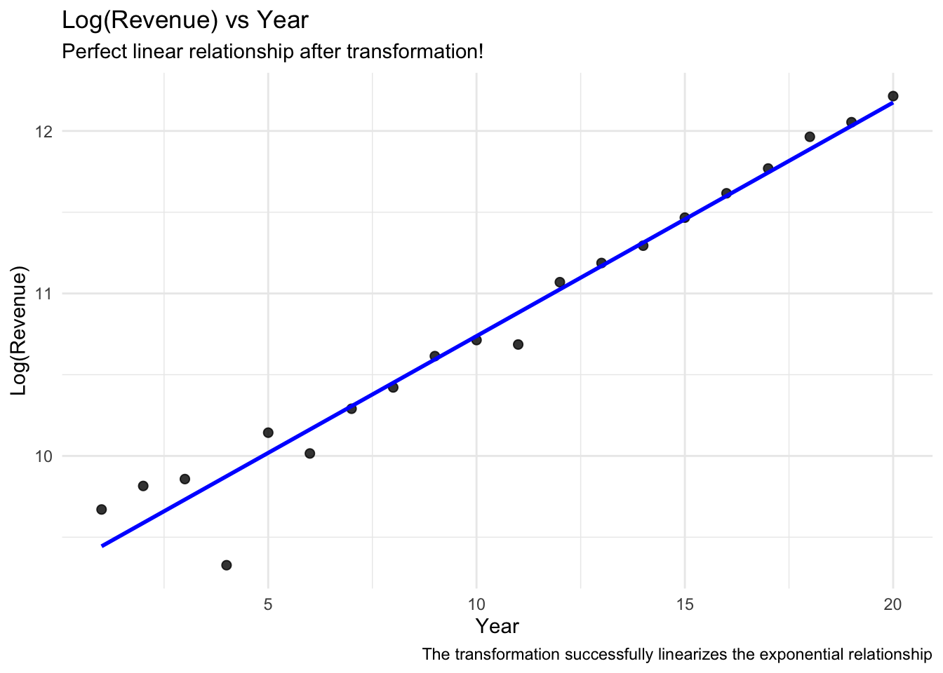 This transforms the exponential curve into a straight line where: - The slope B represents the growth rate - \(e^B - 1\) gives the percentage change per unit increase in x