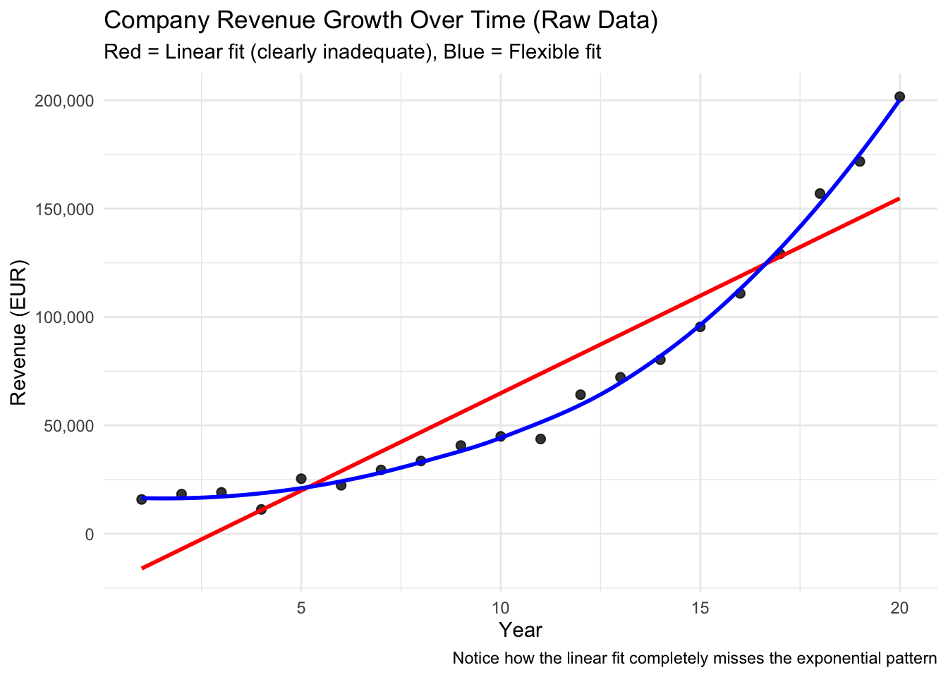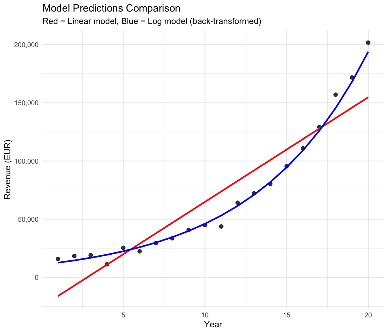 # Show predictions on original scaleexp_predictions <- firm_growth_data %>%mutate(linear_pred =predict(model_linear_exp),log_pred =exp(predict(model_log_exp, newdata = firm_growth_data_log)) )p3 <-ggplot(exp_predictions, aes(x = year)) +geom_point(aes(y = revenue), size =2, alpha =0.8) +geom_line(aes(y = linear_pred), color ="red", linewidth =1) +geom_line(aes(y = log_pred), color ="blue", linewidth =1) +labs(title ="Model Predictions Comparison",subtitle ="Red = Linear model, Blue = Log model (back-transformed)",x ="Year", y ="Revenue (EUR)") +scale_y_continuous(labels = scales::comma) +theme_minimal()p3