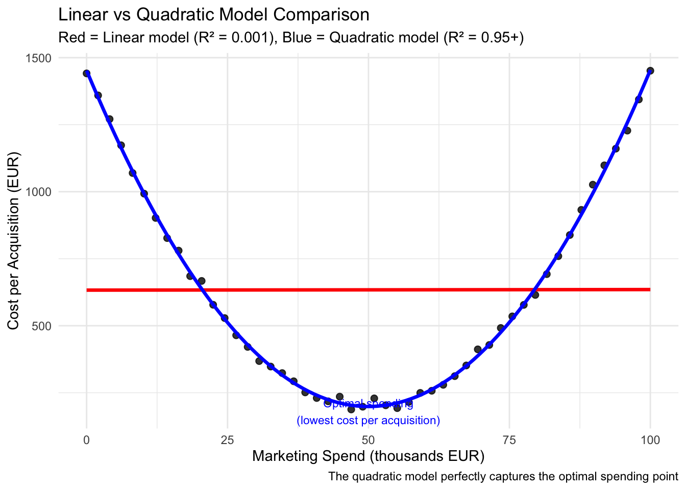 # Create squared term for quadratic modelmarketing_efficiency_data <- marketing_efficiency_data %>%mutate(marketing_spend_squared = marketing_spend^2)# Fit both modelsmarketing_linear <-lm(cost_per_acquisition ~ marketing_spend, data = marketing_efficiency_data)marketing_quadratic <-lm(cost_per_acquisition ~ marketing_spend + marketing_spend_squared, data = marketing_efficiency_data)# Show regression resultscat("=== LINEAR MODEL (completely inadequate) ===\n")