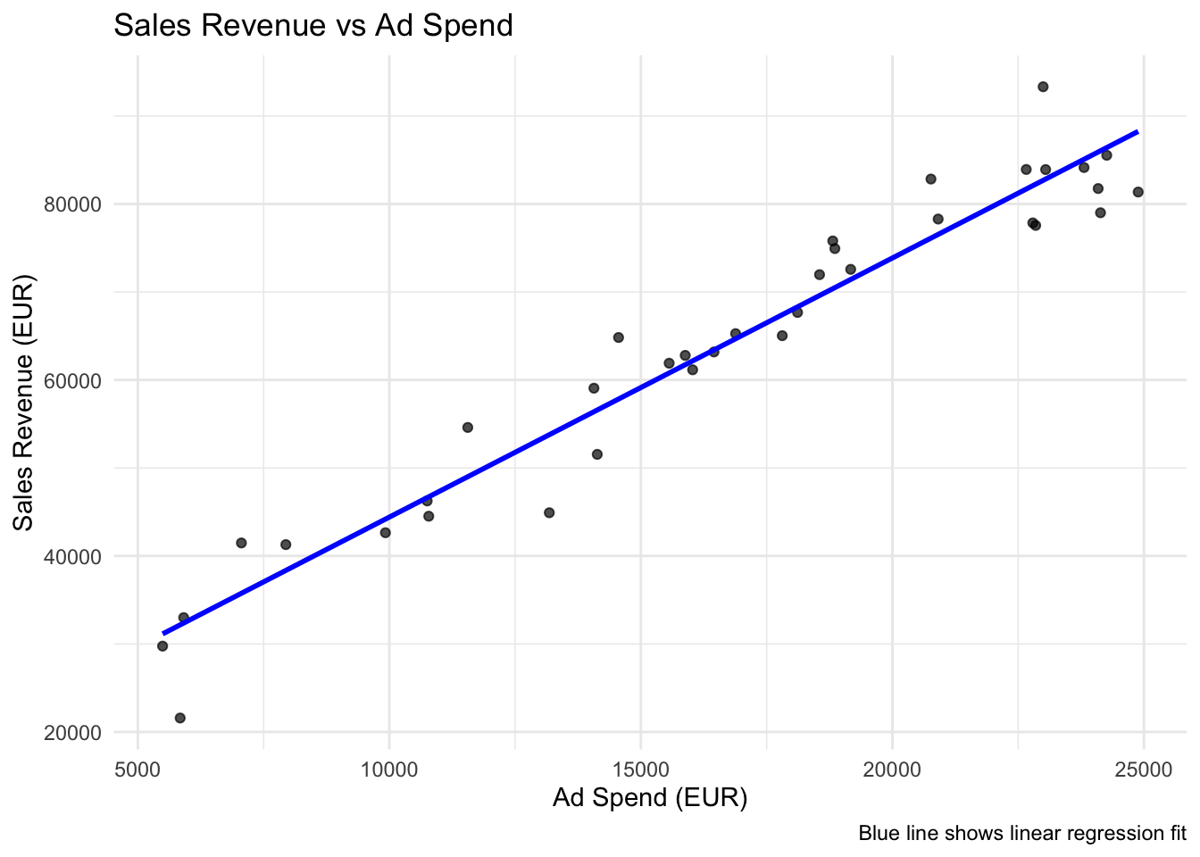 # Create scatter plot with regression lineggplot(marketing_data, aes(x = ad_spend, y = sales_revenue)) +geom_point(alpha =0.7) +geom_smooth(method ="lm", se =FALSE, color ="blue", linewidth =1) +labs(title ="Sales Revenue vs Ad Spend",x ="Ad Spend (EUR)",y ="Sales Revenue (EUR)",caption ="Blue line shows linear regression fit" ) +theme_minimal()