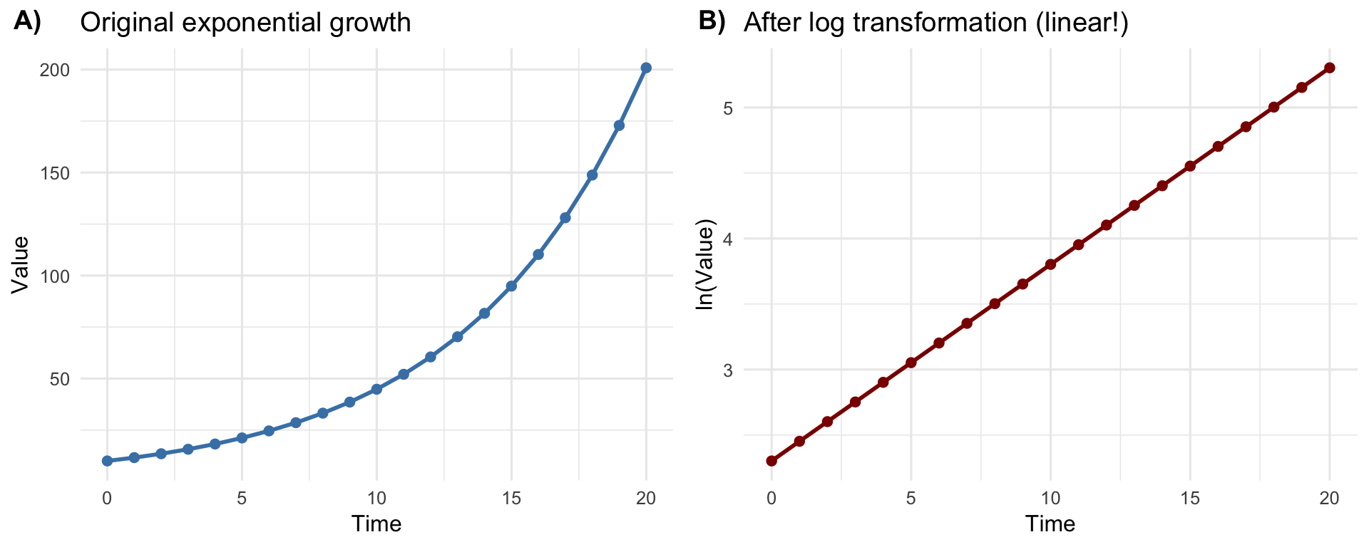 By taking the natural logarithm of exponentially growing data, we transform that curved, accelerating relationship into a straight line, as shown in Figure 1. This is why this kind of transformation is particularly helpful in the context of linear regression.