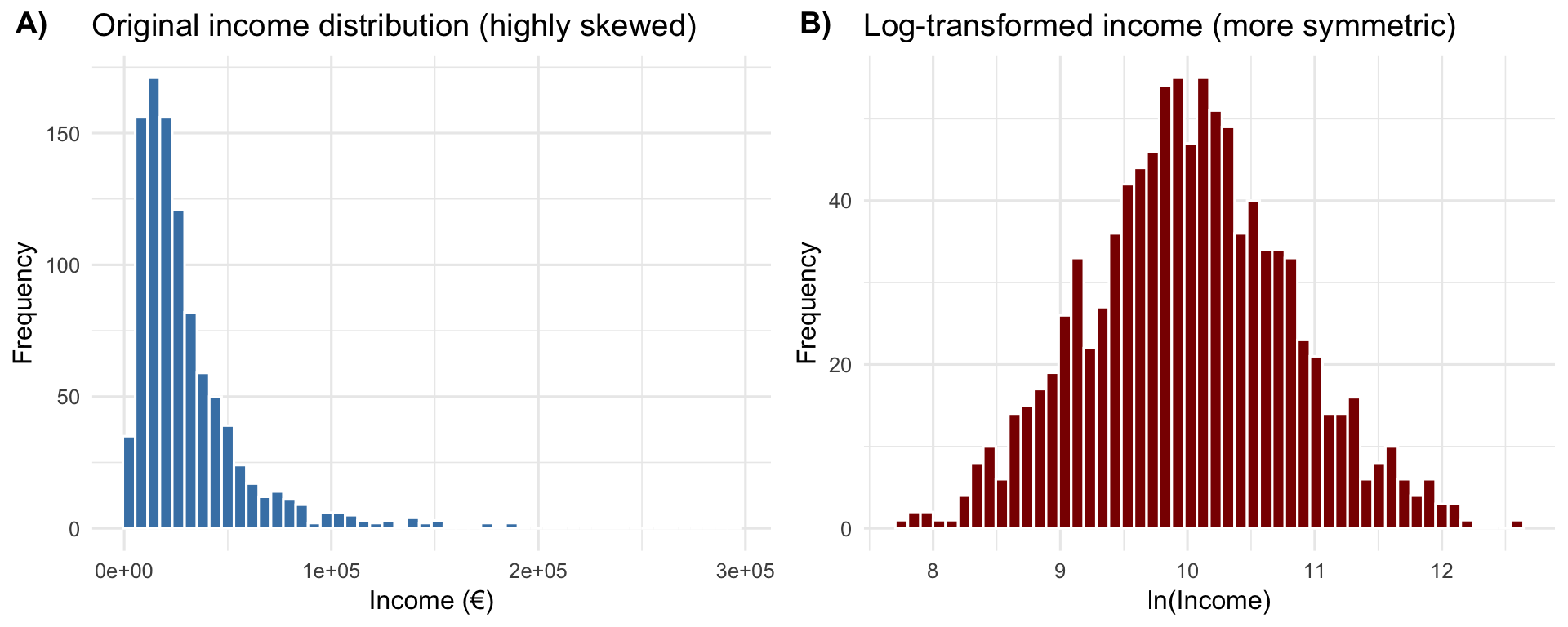 Interpreting percentage changes. When we use logarithms in regression models, our results tell us about proportional or percentage changes rather than absolute changes. For instance, if you’re studying how education affects income, using log(income) helps you say “an extra year of education is associated with a 10% increase in income” rather than “an extra year increases income by EUR 5,000” — which is more meaningful since a 5,000 EUR increase means very different things to someone earning 20,000 EUR versus 200,000 EUR.