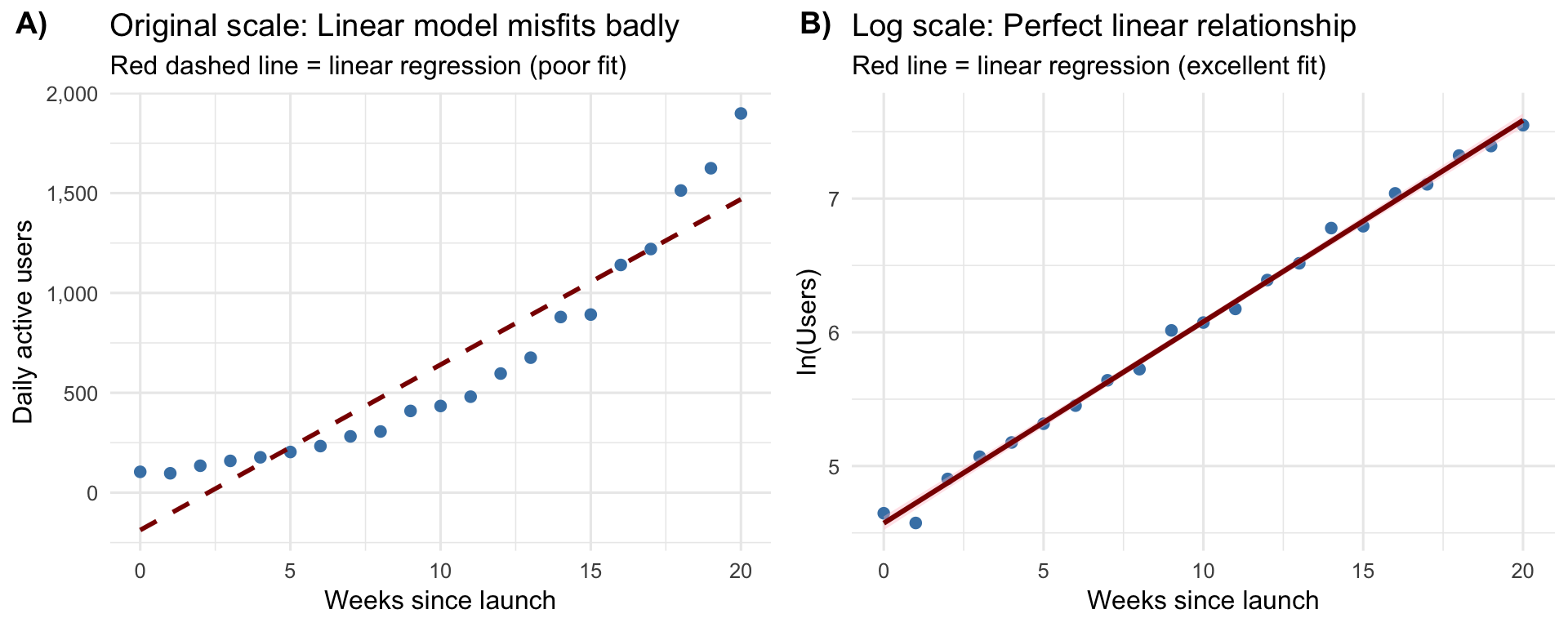 In this example, the coefficient for weeks (0.151, see Table 1) tells us users are growing at approximately 15.1% per week—going from around 97 users at launch to over 1,899 users after 20 weeks. This exponential pattern is typical in the early viral growth phase of successful apps like Instagram, TikTok, or WhatsApp before they hit market saturation.