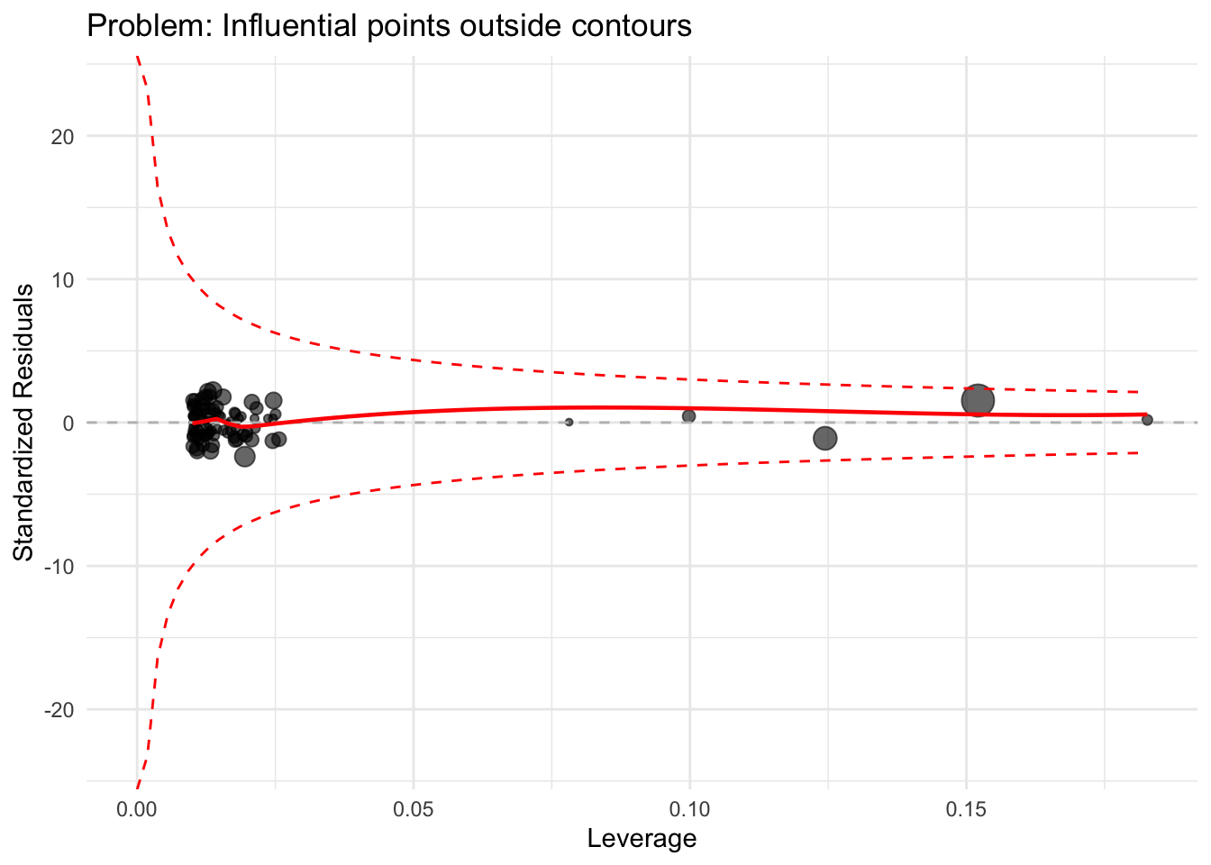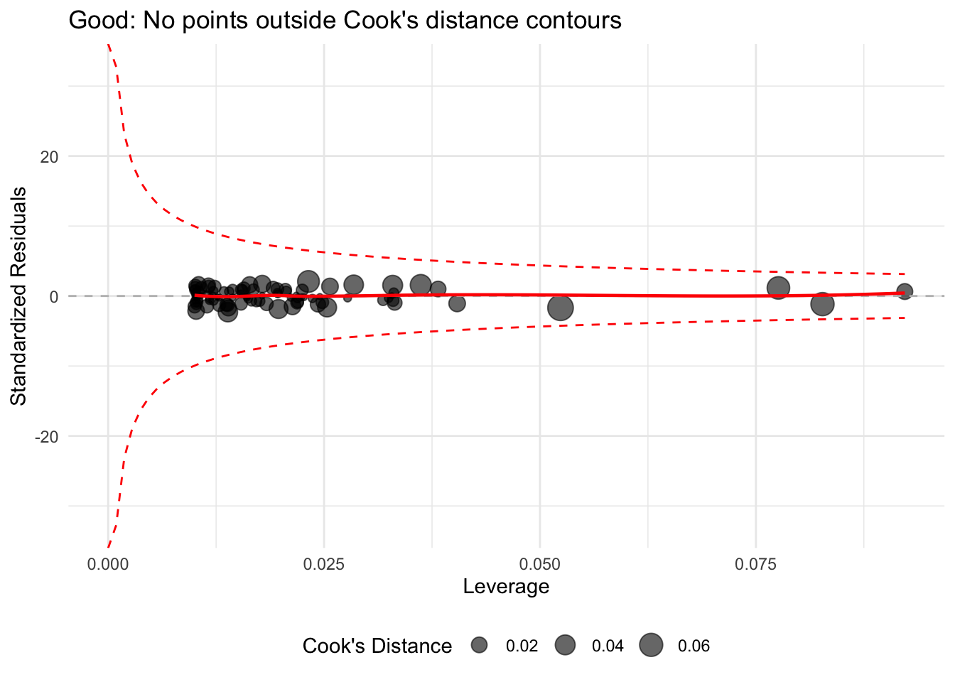 What it means: No single observation has disproportionate influence on the regression estimates. While not a formal distributional assumption, influential points can dramatically change your conclusions.