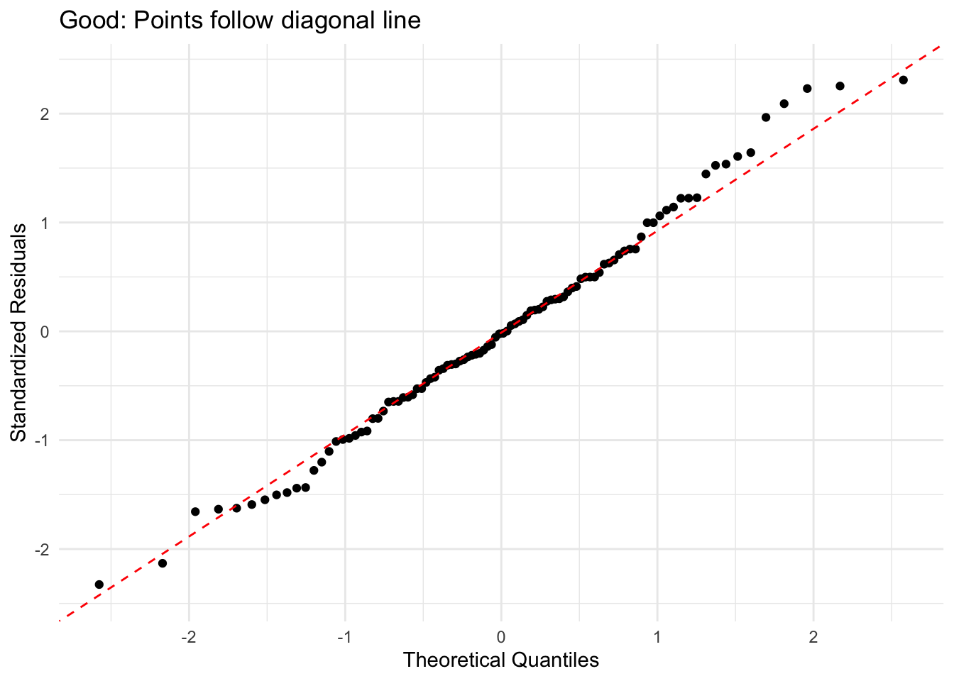 How it works: Plots the quantiles of standardized residuals against theoretical quantiles from a standard normal distribution. If residuals are normally distributed, points should fall along the diagonal reference line.