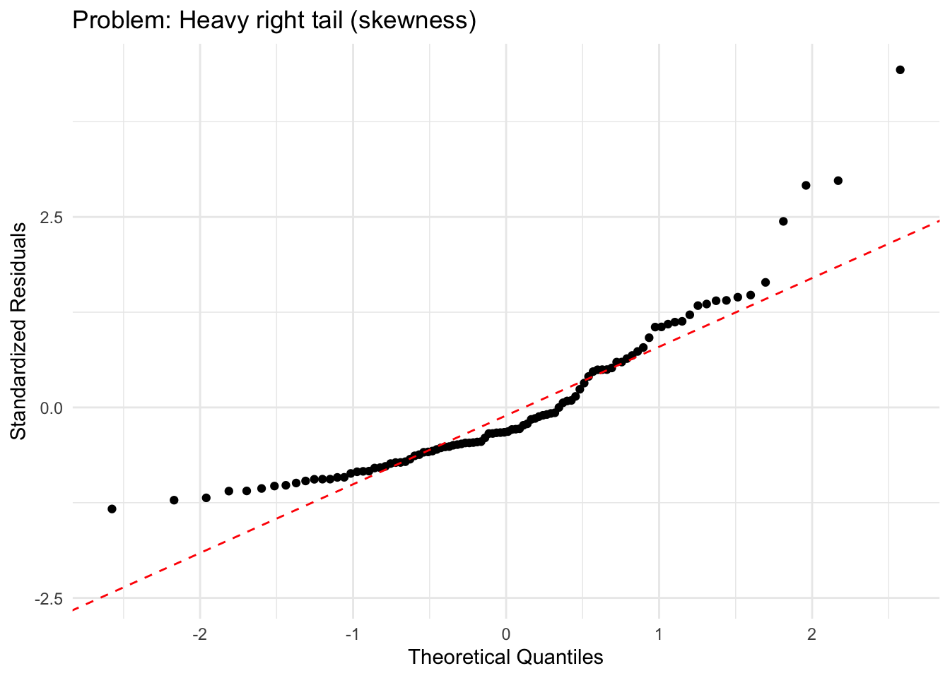 Why it matters: Independence is required for valid standard errors and hypothesis tests. When observations are correlated (e.g., repeated measurements from the same person, or time series data), standard errors are typically underestimated, leading to overconfident conclusions.