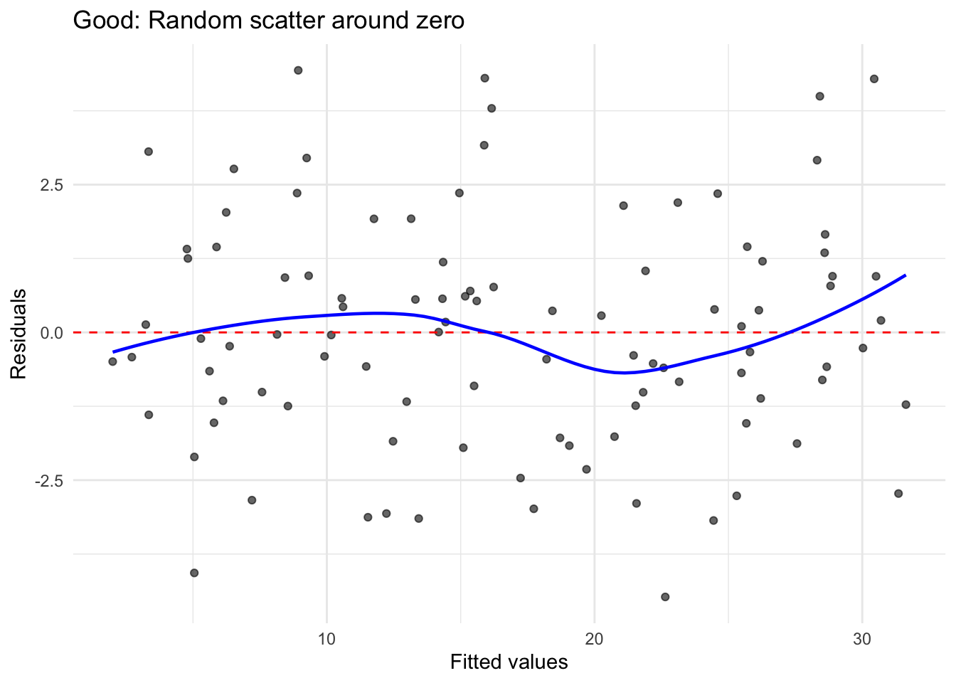 How it works: Plots residuals (\(e_i = y_i - \hat{y}_i\)) against fitted values (\(\hat{y}_i\)). If the linearity and homoscedasticity assumptions hold, residuals should be randomly scattered around zero with no patterns or trends.
