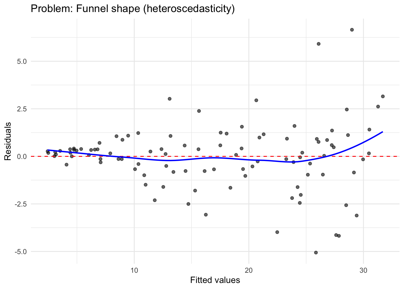 Why it matters: Heteroscedasticity (non-constant variance) leads to inefficient estimates and incorrect standard errors. While coefficient estimates remain unbiased, hypothesis tests and confidence intervals become unreliable.