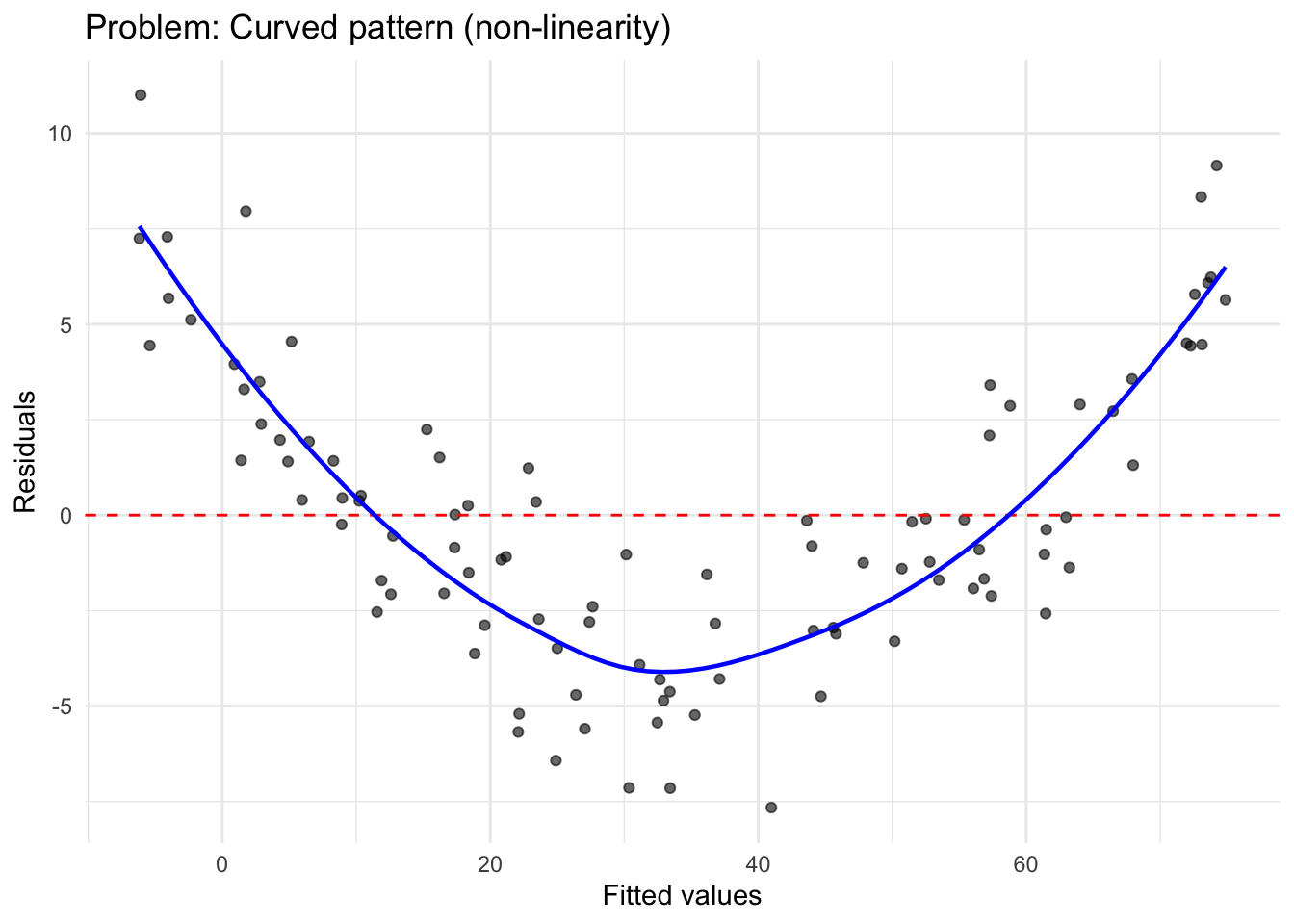 Why it matters: Linear regression models can only capture linear relationships. If the true relationship is curved or more complex, the model will systematically mispredict values, leading to biased estimates and poor fit.