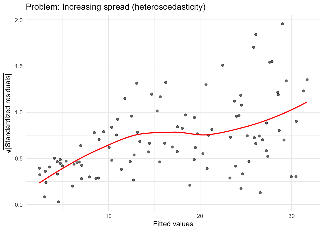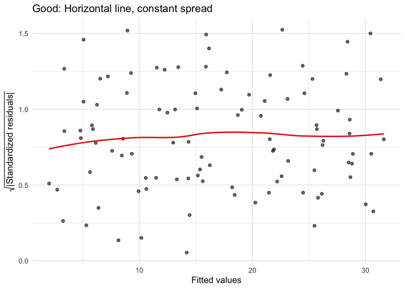 How it works: Plots the square root of standardized residuals (\(\sqrt{|e_i^*|}\)) against fitted values. The square root transformation stabilizes variance and makes patterns of heteroscedasticity easier to detect.
