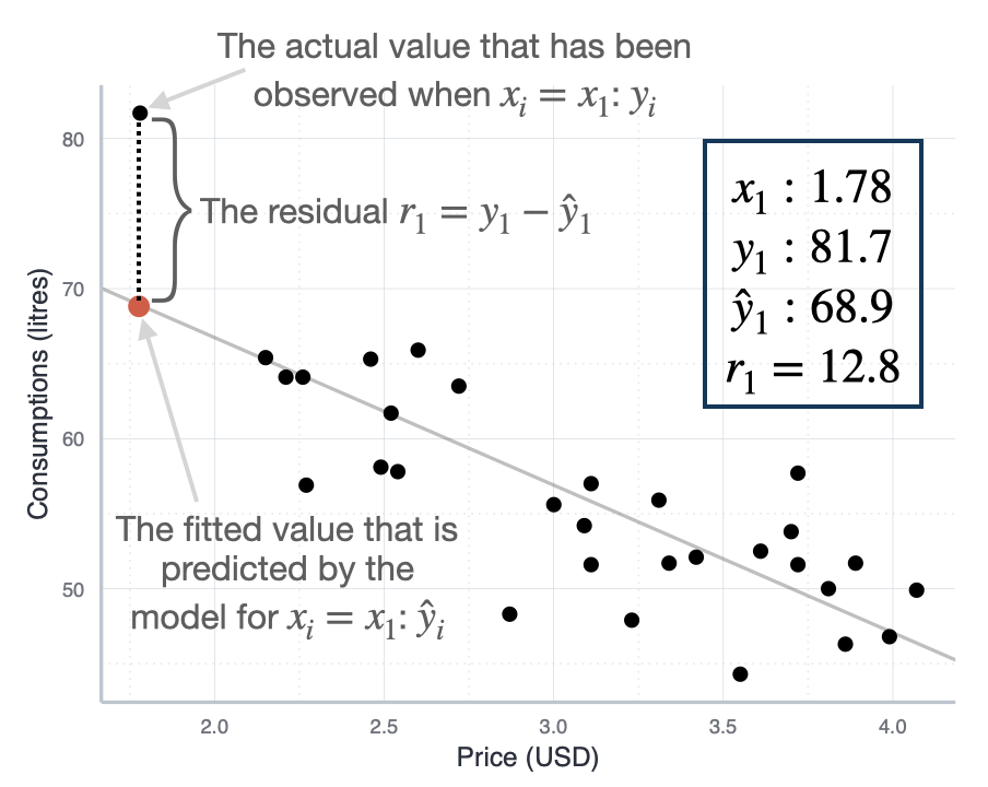 The residual (\(e_i\)) is what we actually observe from our fitted sample model: