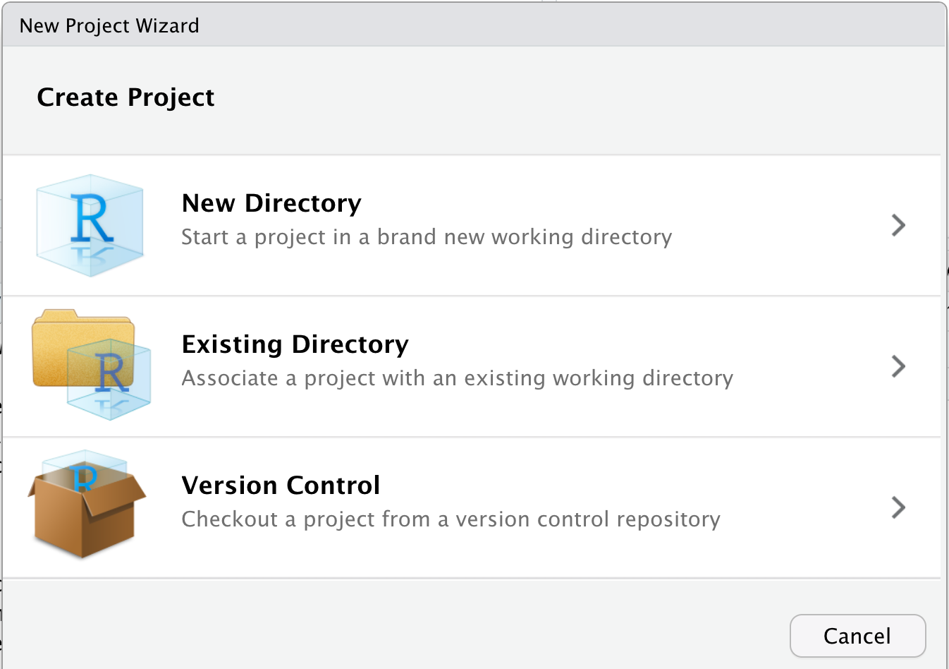 After having identified the right place for our project on our computer, we will now create an R-project at exactly this place. To this place, open R-Studio, and either click on File/New Project, or on the blue botton in the upper left part of the pane, directly to the right of the New File button. You should now see the ‘New Project Wizard’: