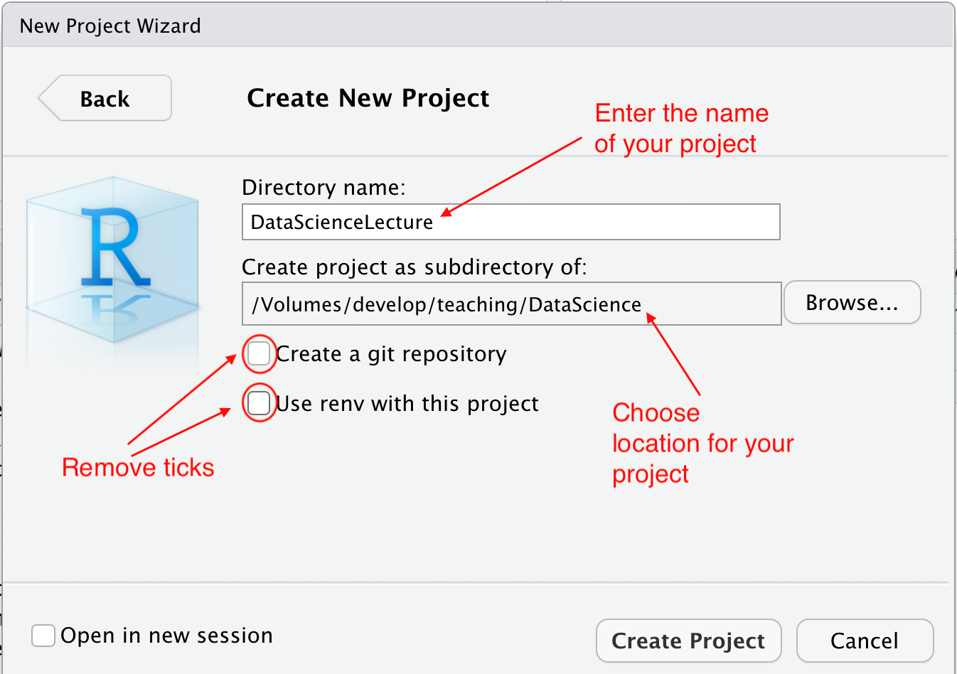 We could also have created a folder in the previous step and then chosen this folder here via Existing directory. This is useful if you want to add an R project file to an already existing project, but the approach of creating a new directory is more general and should be your default approach.↩︎