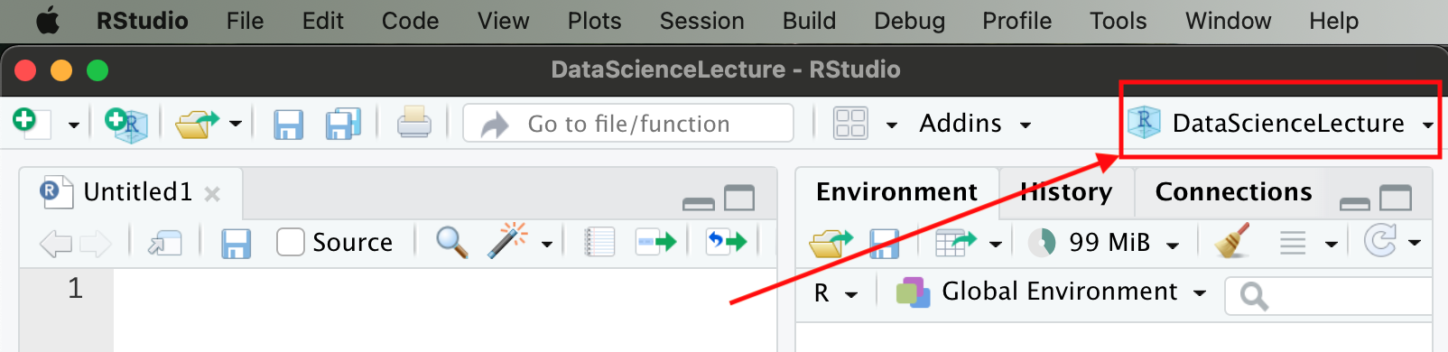 You should always make sure that when you work on your project using R-Studio, the current session is linked to this project. You can see the project your current session is linked to in the upper right of the R-Studio pane: